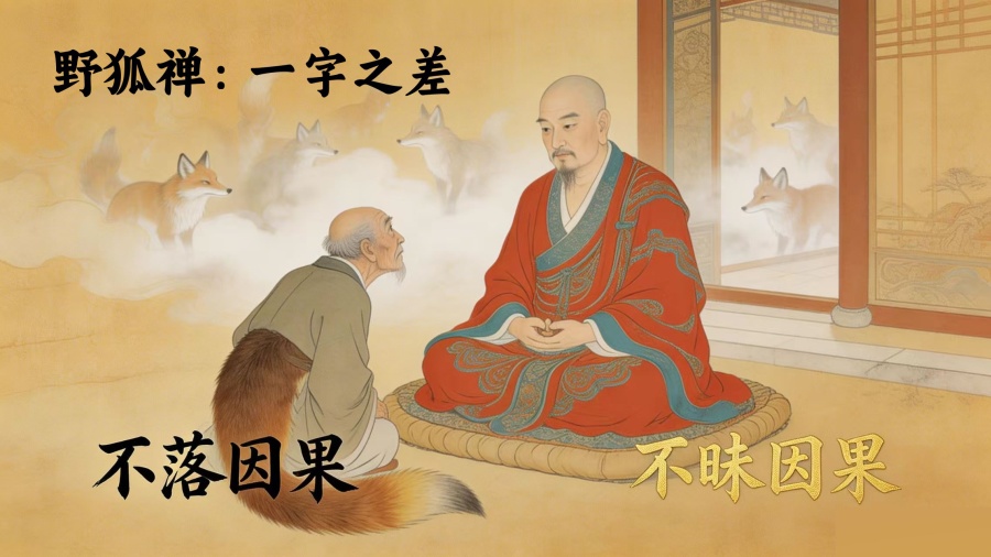 还有一个禅宗公案,叫“野狐禅”。百丈禅师上堂说法时,常有一位老人随众听法。一天,老人独留,自称过去五百世曾是一只野狐。他请教百丈:为什么堕为野狐?原来,他过去世也是一位修行人,有学人问他:“大修行人还落因果吗?”他答:“不落因果。” 就因为这一字之差,他堕为野狐五百世。现在他恳请百丈代他下一转语。百丈说:“你问。” 老人便问:“大修行人还落因果吗?” 百丈答道:“不昧因果。” 老人言下大悟,脱去野狐身。